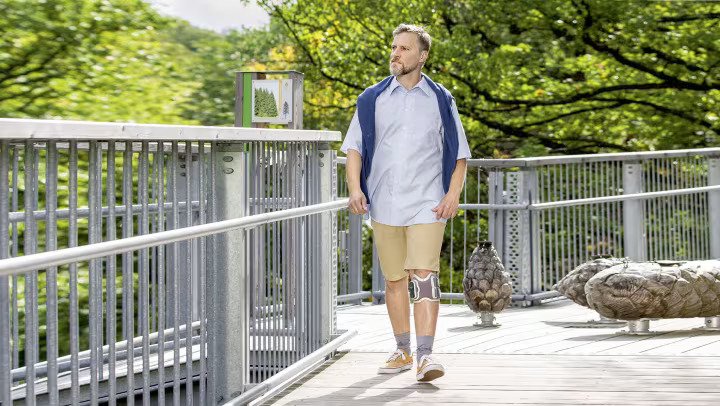 Optional ist eine zusätzliche Oberschenkelmanschette verfügbar, die Kniebeugung und -streckung bei Instabilität unterstützt.
